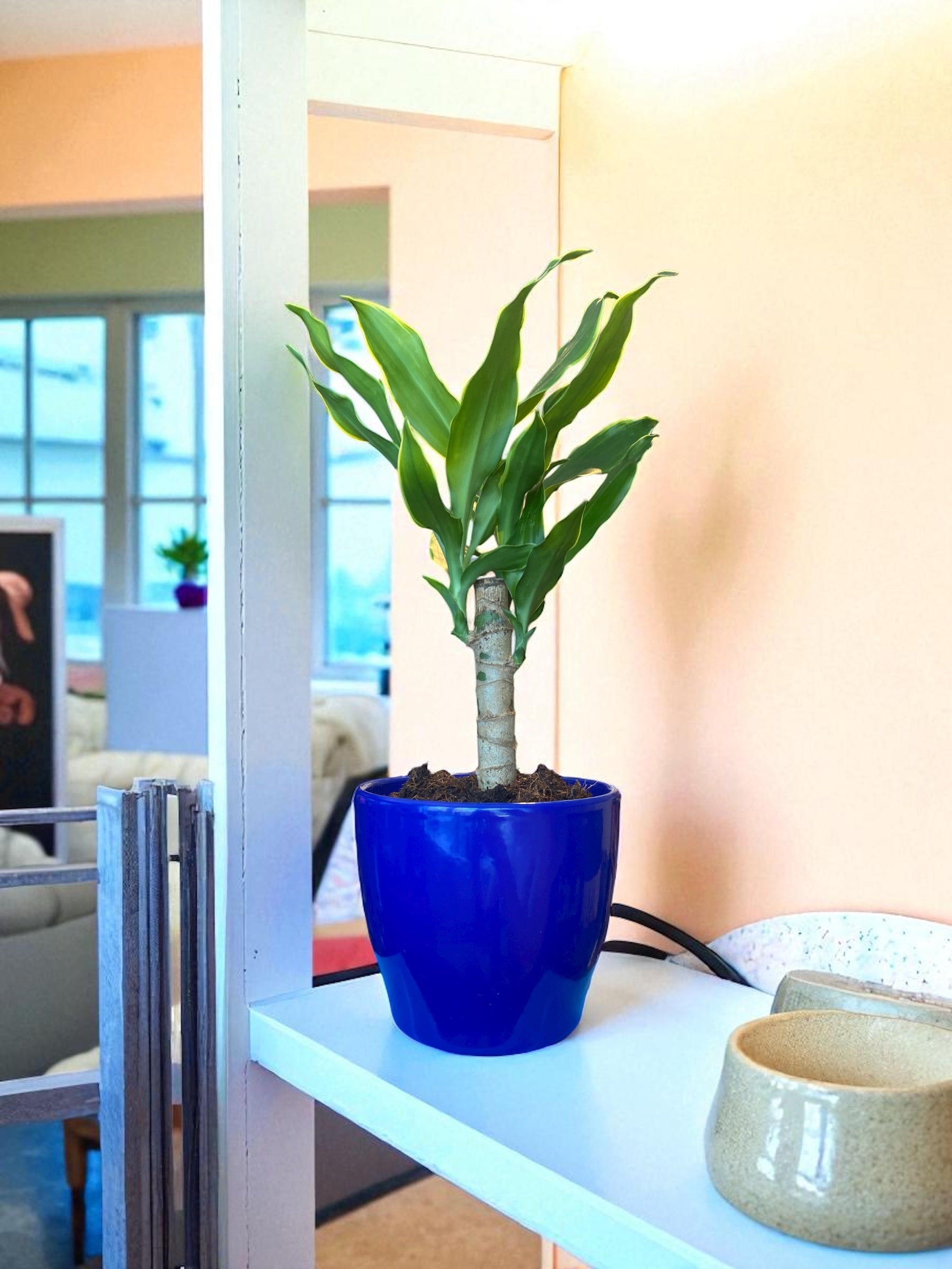 The Corn Plant (Dracaena Massangeana) is a bold houseplant featuring long, arching green leaves with a bright yellow central stripe. With its upright, cane-like stems and lush foliage, it adds a tropical, tree-like presence to interiors. Low-maintenance and highly adaptable, this plant is perfect for homes and offices alike, offering an easy-care way to bring greenery and height into any space. Its air-purifying qualities make it both a stylish and functional addition to your indoor jungle.
