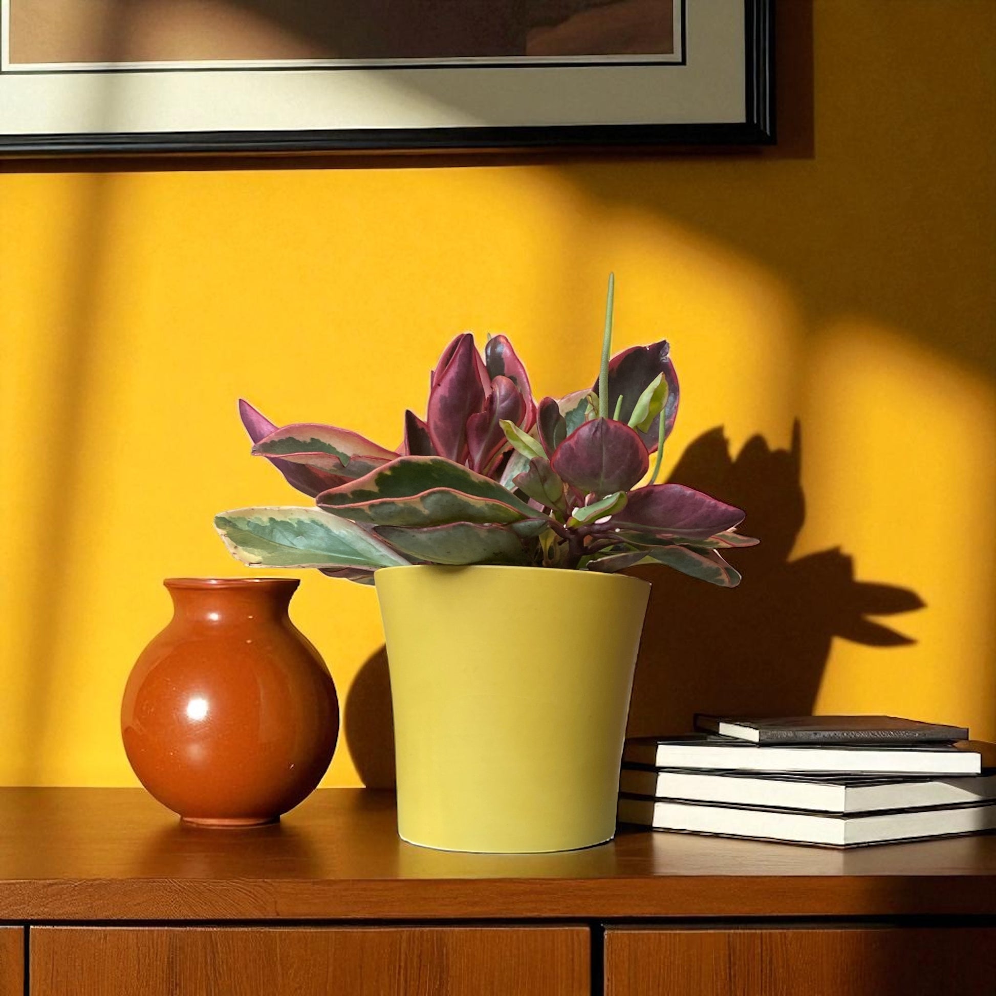 Ginny Peperomia (Peperomia clusiifolia Ginny) is a compact and colourful houseplant prized for its stunning tri-colored foliage. Each thick, waxy leaf features a mix of deep green centers, creamy-white margins, and vivid pink edges, giving it a vibrant look. With its low-growing, bushy form and easy-care nature, Ginny adds a cheerful pop of color to shelves, desks, or windowsills. Perfect for small spaces and plant beginners, this tropical beauty brings charm and character to any indoor setting with minimal fuss.